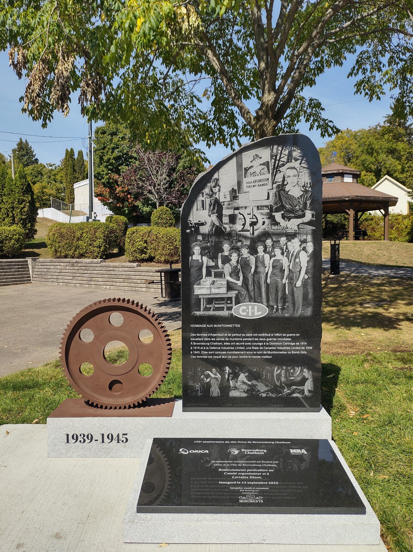 In 2025, the Bomb Girls Legacy Foundation worked with the Town of Brownsburg, Quebec and the City of Toronto to unveil two memorial plaques celebrating Bomb Girls. Brownsburg boasts a storied past of munitions work in Canada, dating back to 1875. Lorraine Dixon, a native of Brownsburg, worked with local government, the Bomb Girls Legacy Foundation, and Orica – the munitions company that operates in town today – to bring this initiative to life. For the town’s 150th anniversary, on September 13, 2025, the Town of Brownsburg and Orica unveiled a phenomenal monument dedicated to the legacy of Canada’s Bomb Girls.